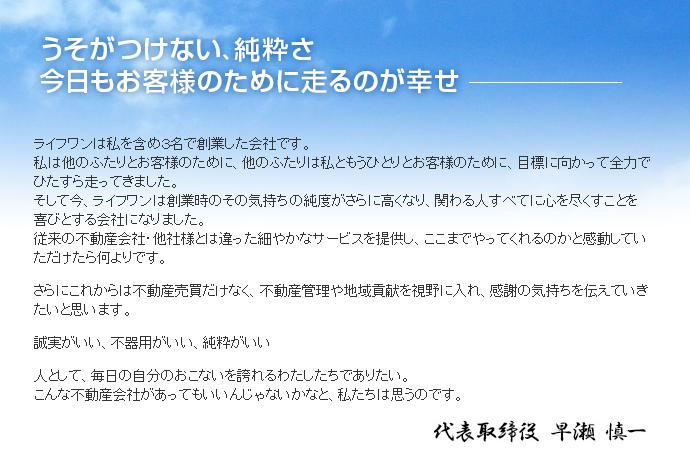 そして今、ライフワンは創業時のその気持ちの純度がさらに高くなり、関わる人すべてに心を尽くすことを喜びとする会社になりました。